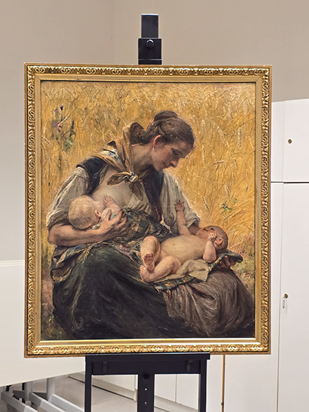 Das Bild wurde in Niederschlesien, in Wölfelsgrund (Międzygórze), gemalt. Im Jahre 1906 wurde es vom Schlesischen Kunstverein gekauft und befand sich zum Ausbruch des Zweiten Weltkrieges im Schlesischen Museum der Bildenden Künste. Die letzte Spur von dem Bild geht auf die 30. Jahre des 20. Jahrhunderts zurück. Das Bild wurde 1939 aus dem Museum ausgeliehen und hing mit den anderen drei Bildern in der Viktoriaschule in der Blücherstraße (heute das 1. Lyzeum in der Poniatowskiego-Str.). Die Schule bildete Mädchen aus, deshalb sollte das Bild wahrscheinlich ein Beispiel geben, wie die Rolle der Frauen im III. Reich sein soll. Das Bild passte thematisch der Propaganda der Nazizeit: Kult der Mutterschaft, der Natur, der Vitalität, der Hingabe. Es stellt eine Schlesierin mit Zwillingen dar: das eine Kind wird gestillt, das andere liegt fröhlich auf dem Mutterschoß. Im Hintergrund ist die schlesische Landschaft sichtbar – der reife Sommer.