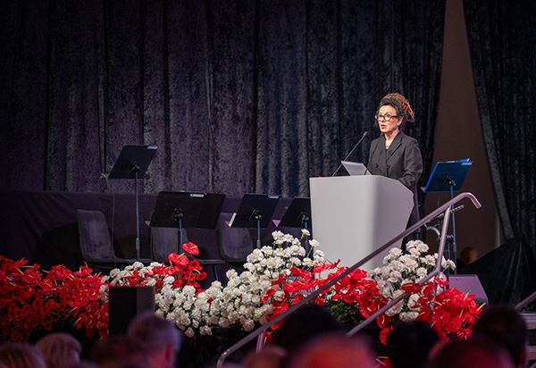 Als sie über die Identität der heutigen Einwohner sprach, wies sie darauf hin, dass diese unabhängig – oder besser gesagt: entgegen – den Bemühungen der Propaganda entstanden sei und nicht das Ergebnis eines politischen Programms sei. „Diese Mischung aus Völkern, die nach dem Krieg in die westlichen Gebiete gekommen sind – dieser Schmelztiegel aus Sprachen, Kulturen, Religionen und Mentalitäten – hat in tiefgreifenden Prozessen des kollektiven Bewusstseins eine eigene Identität entwickelt. Abgeneigt und müde von der politischen kommunistisch-nationalistischen Propaganda”, erklärte sie. Sie betonte, dass es sich um eine „befreiende” Identität handele, die nicht in starren Formen oder Rahmen gefangen sei, sondern ständig andere Wege, Modelle, Modi und Formen des Daseins erforsche: – Dadurch wird sie zu einer Identität, die sucht und auch Neues, Unbekanntes und Anderes in sich verkörpert. Ihr Wesen ist eine intelligente, aber auch mutige Veränderung. Heute haben wir die Gelegenheit, uns in Ruhe zu fragen, was diese 80 Jahre der jüngsten Geschichte waren, was wir aufgebaut haben und was wir verlieren mussten. Und wer wir sind”, fasste die Nobelpreisträgerin zusammen.