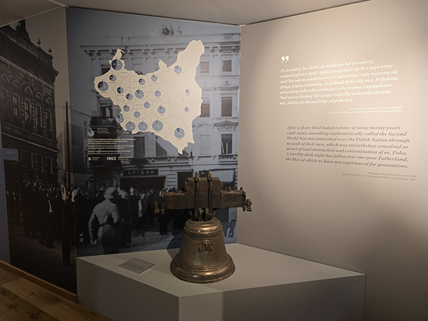 Die Besichtigung der Ausstellung beginnt mit der Einführung in den historischen Kontext: der Darstellung der zwei totalitären Systeme, die zum Zweiten Weltkrieg führten. Die deutsche Besatzung symbolisiert auf der Ausstellung eine Glocke, die aus den polnischen Gebieten geraubt wurde und „zu den Kriegszwecken“ verschmolzen sein sollte. Glücklicherweise überdauerte die Glocke in Deutschland und kehrte im 21. Jahrhundert nach Polen zurück. Sie wird vor einer Tafel präsentiert, auf der die Zahlen der ermordeten Geistlichen in den einzelnen Gemeinden Polens gezeigt wurden. Insgesamt war das 20% aller Geistlichen, die das Leben verloren haben. In diesem Zusammenhang wird sichtbar, wie bedeutend die Geste der Botschaft der polnischen Bischöfe an die deutschen Bischöfe war.
